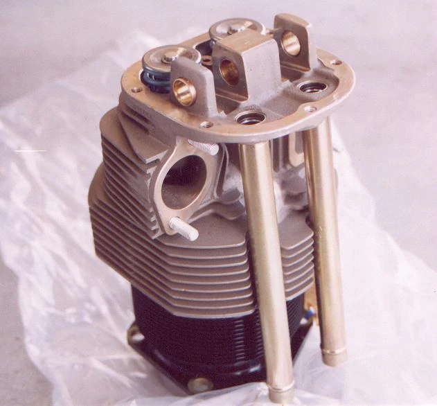 A cylinder from an air-cooled aviation engine, a Continental C85. Notice the rows of fins on both the steel cylinder barrel and the aluminum cylinder head. The fins provide additional surface area for air to pass over the cylinder and absorb heat.