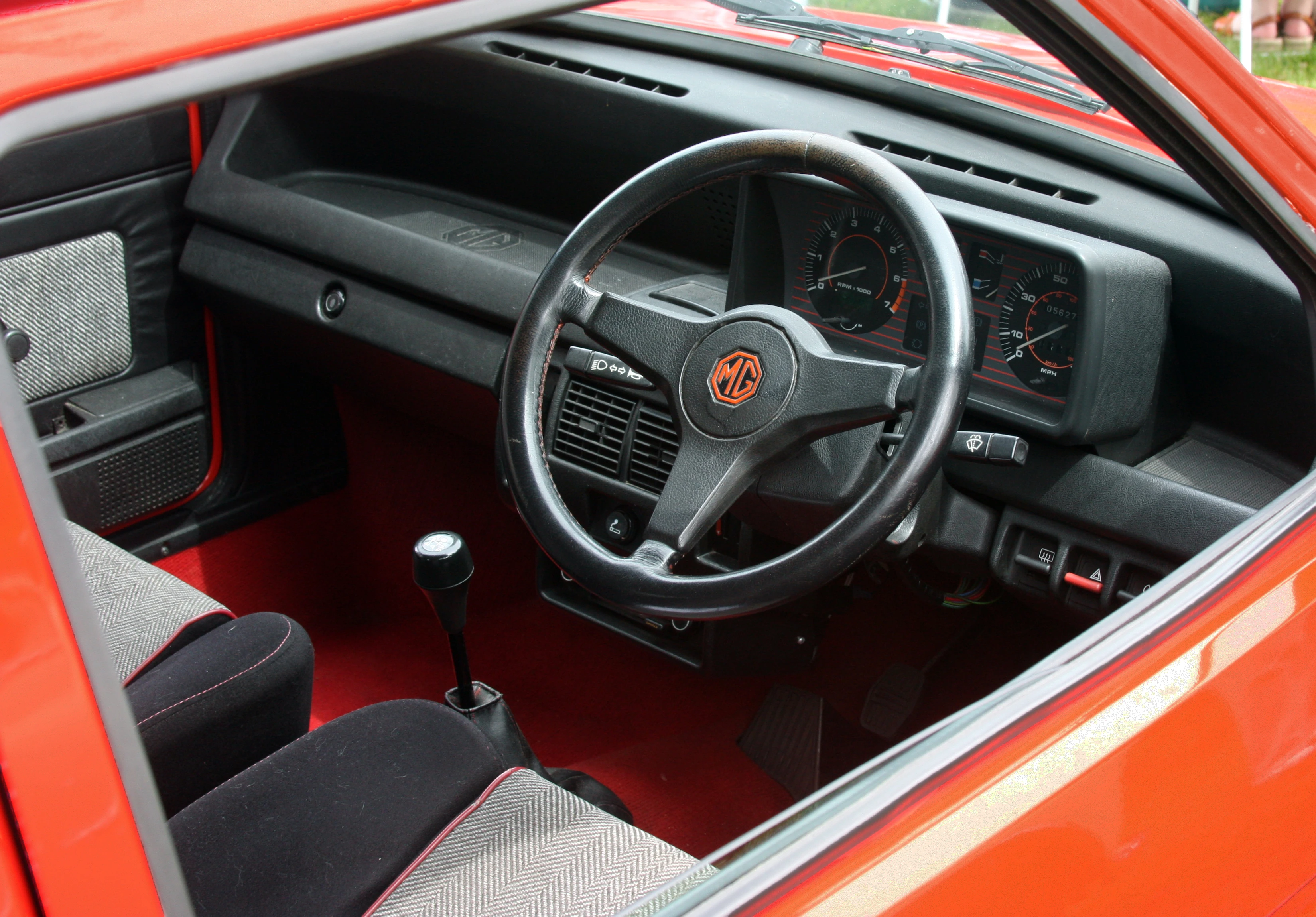 The interior of a 1982 MG Metro MkI. The MkII featured a revised interior with controls moved away from the centre console and onto the dashboard.