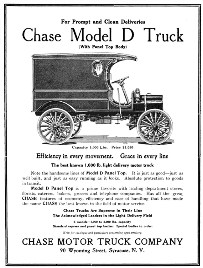 In 1912, Chase advertised that "trucks are bought in group lots." They had five models that year with bed capacities from 1,000 pounds (450 kg) to the Model J Express at 4,000 pounds (1,800 kg).[5]