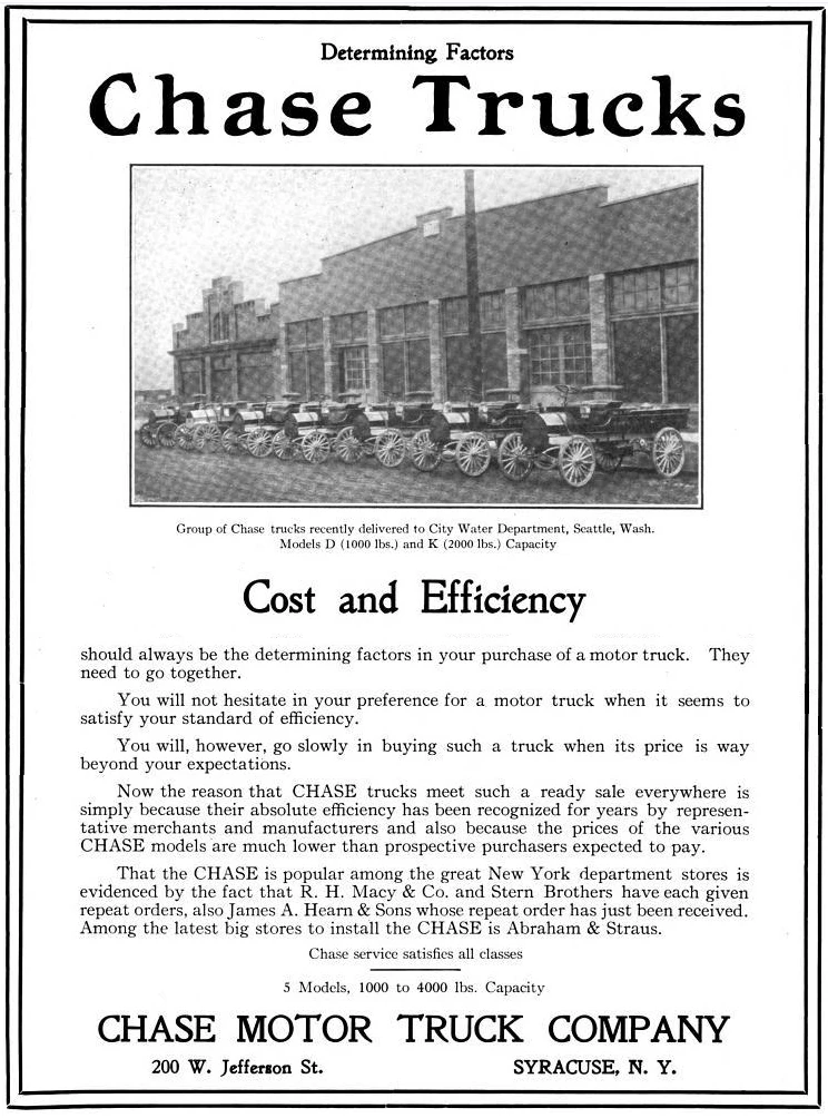 By June 1912, the company advertised that Chase was popular among the great New York department stores including; R. H. Macy & Company and James A. Hearn & Sons as well as Stern Brothers who were repeat customers. Abraham & Strauss was a new customer that month and bought a special Model K. The Chase dealers in Minneapolis, Minnesota, placed an order for 62 trucks, of which six were delivered to the Dakota Central Telephone Company of Aberdeen, South Dakota.[11]