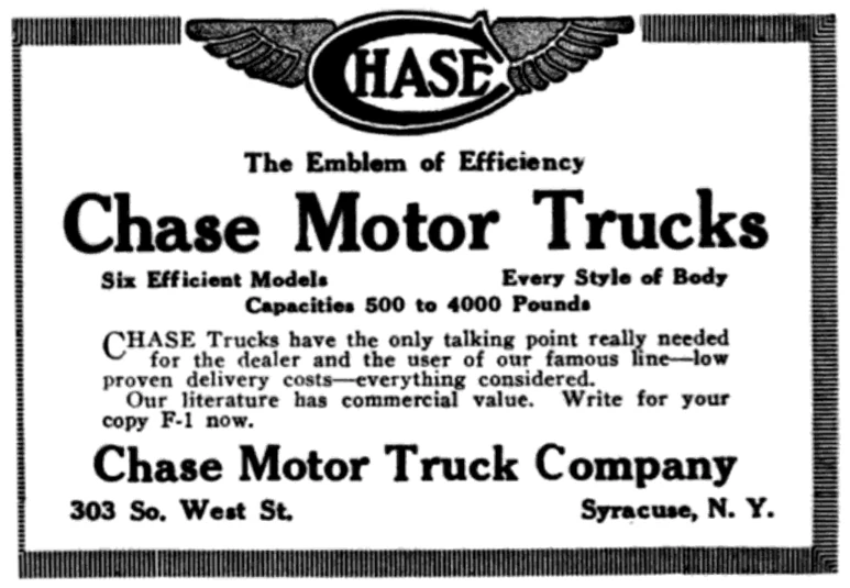 Chase was credited as the first manufacturer to build commercial grade motor trucks. Early Chase trucks had "big, buggy-type wheels" and could attain a speed of 25 mph (40 km/h) on a "suitable grade."[3] By 1912, the company ended its foray into passenger cars and focused on building motor trucks exclusively.[3]