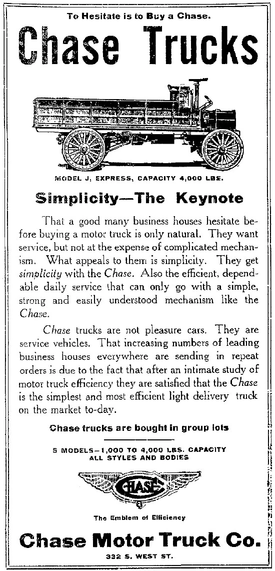 The company motto in 1912 advertisements was "The emblem of efficiency."[4] According to the company, "Chase trucks are not pleasure cars. They are service vehicles. That increasing numbers of leading business houses everywhere are sending in repeat orders is due to the fact that after an intimate study of motor truck efficiency they are satisfied that the Chase truck is the simplest and most efficient light delivery truck on the market to-day."[5]