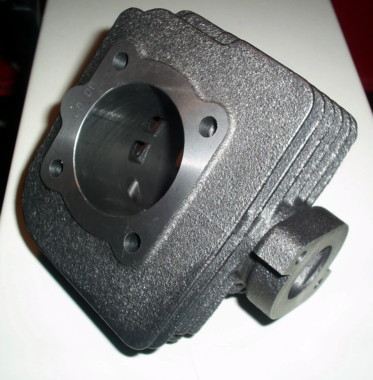 Malossi air-cooled cylinder for two-stroke scooters. The exhaust port is visible to the right.