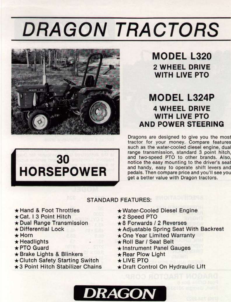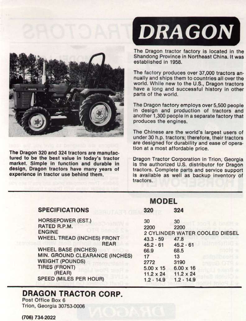 Dragon Tractor Corp. was founded in Placerville, California, USA in 1987 to import tractors and equipment from China. The company eventually moved to Trion, Georgia.