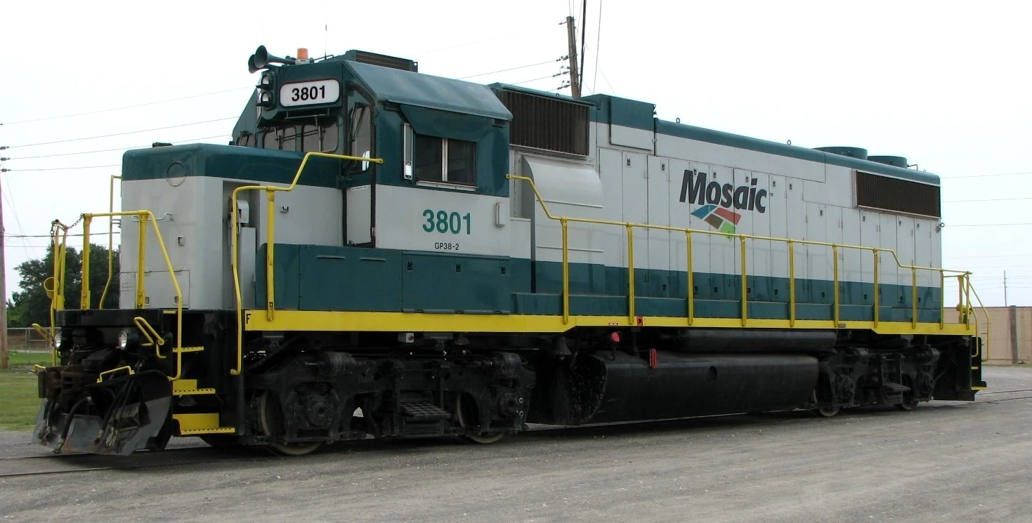 Mosaic 3801, an EMD GP38-2 — at Agrock Yard near Brewster, Florida.