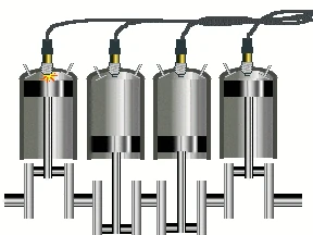One complete cycle of a four cylinder, four stroke engine. The volume displaced is marked in orange.
