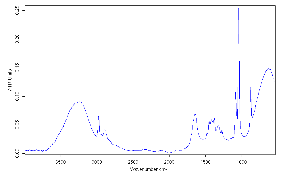 Infrared reflection spectra of liquid ethanol, showing the -OH band centered at ~3300 cm−1 and C-H bands at ~2950 cm−1.