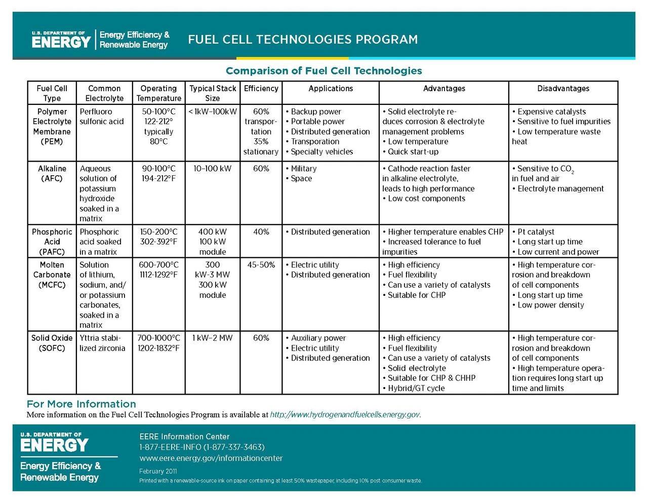 - ↑ "Comparison of Fuel Cell Technologies". Departement of Energy Energy Efficiency and Renewable Energy Fuel Cell Technologies Program. February 2011.