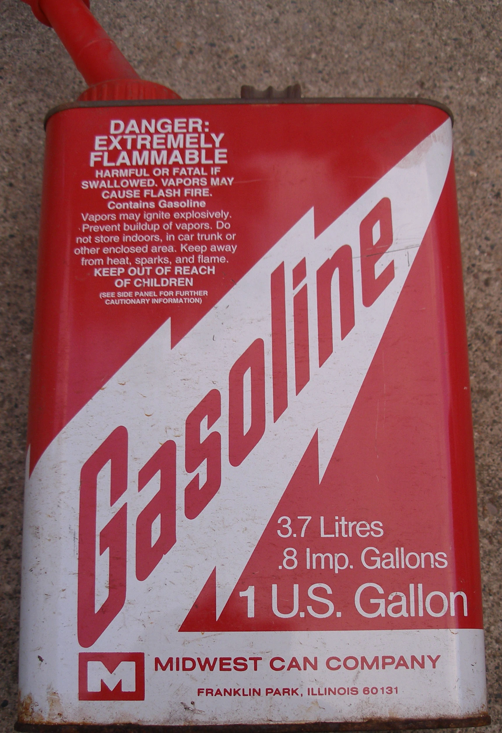 A one U.S. gallon gas can purchased near the U.S.-Canada border. It shows equivalences in Imperial gallons and litres.