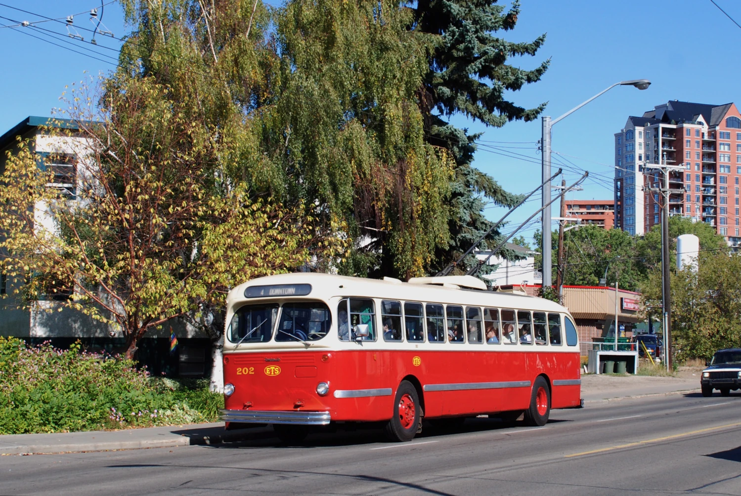 The lines that operated interurban passenger cars recognized in the mid 1920s that they badly needed faster and more efficient equipment. Up to that time, both the wood and the steel interurban cars were very large, sat high, and were heavy. Car manufacturers such as Cincinnati Car Co., St. Louis Car Co., and Pullman worked to design equipment for a better ride at speed, improved passenger comfort, and lower power consumption. This included designing trucks to be able to handle rough track. Brill in conjunction with Westinghouse and General Electric worked on a new design. The result was the 1929 aluminum and steel wind tunnel developed slope roof Bullet cars, the first of which were purchased by the Philadelphia and Western Railroad, a third rail line running from 69th Street Upper Darby to Norristown in the Philadelphia region.[4] This line still runs as SEPTA Route 100. These Bullets were successful and operated until the 1980s, but not many others were sold. Only central New York state interurban Fonda, Johnstown, and Gloversville ordered Bullets. Five were procured in mid-Depression 1932. In 1936, the abandoned FJ&G sold its Bullets to the Bamberger Railroad in Utah where they ran high speed service Salt Lake City to Ogden until the mid 1950s.[2] The Toronto Transit Commission (TTC) was a client of Brill's and purchased many buses and streetcars over the years. (See TTC Streetcar roster.) Brill produced many trackless trolleys for U.S. cities.