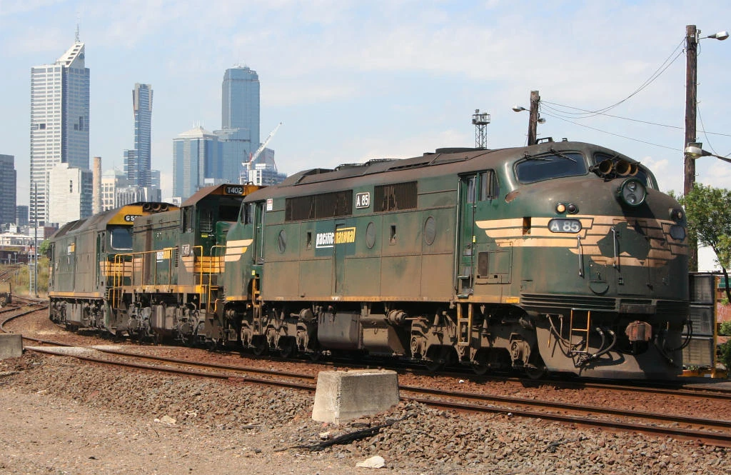 Three body styles of diesel locomotive: cab unit, hood unit and box cab. These locomotives are operated by Pacific National in Australia.