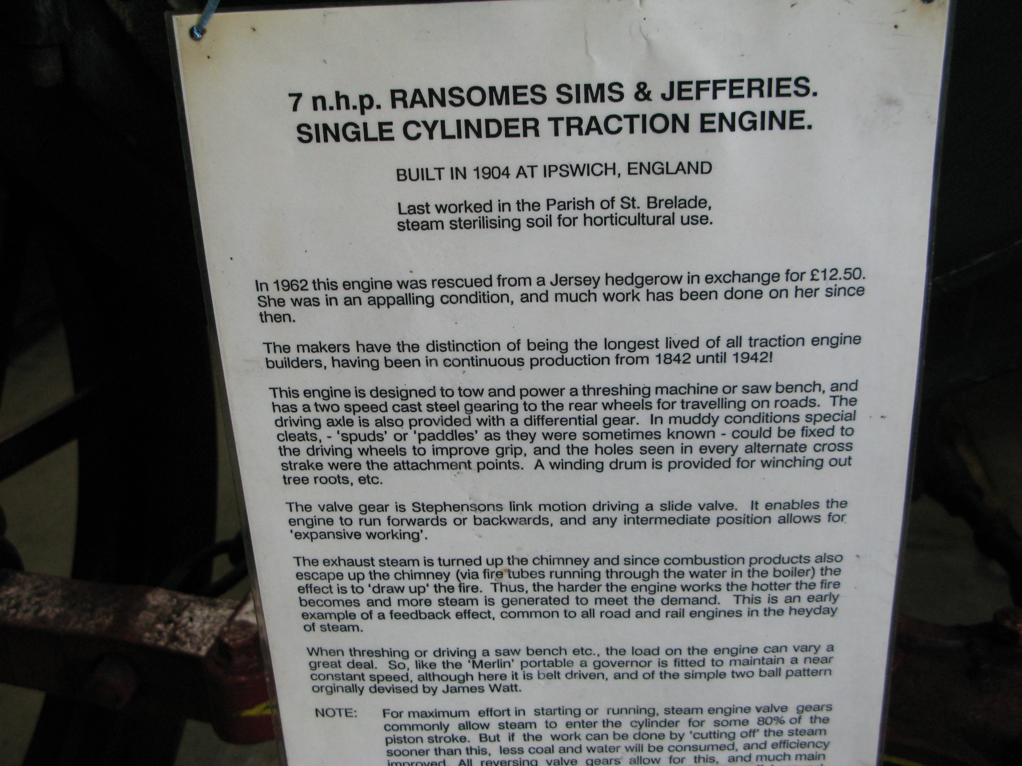 The Jersey based The Pallot Steam Museum at Sion near Trinity has a 1904 RSJ Ransomes Sims & Jefferies Steam Engine nicknamed Dolly May still running well even after more than a century of opperating, and was the first ever machine equipment that the museum acquired. She was bought new and spent most of her long life helping the many Jersey farmers at the time and even in both World Wars as a haulage road tractor and worked heavily ever since, and she was also honoured with being named after Samuel Pallots late wife who was named Dorothy Pallot. The original Dolly May is occasionally still driven regularly in Jersey every Summer for the locally known Battle Of Flowers and shipped to England for the famous Devon Steam Rally Meeting held every year, among with many other original and classic original vehicles.