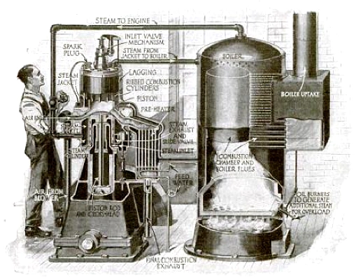 The Still engine was a piston engine that simultaneously used both steam power from an external boiler, and internal combustion from gasoline or diesel, in the same unit. The waste heat from the cylinder and internal combustion exhaust was directed to the steam boiler, resulting in claimed fuel savings of up to 10%.