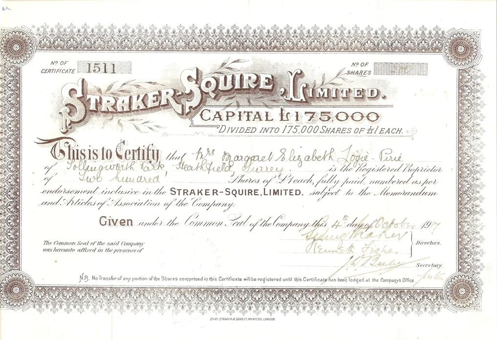 Straker-Squire share certificate from 1917.