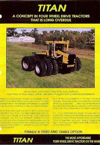 Jack Johnson, the former president of Steiger, formed Titan Tractors of Fargo, North Dakota in the early 1990's to offer the regions farmers abasic solid 4wd tractor at a reasonable cost as the original Steiger tractors had. His concept was to take in high hours used Steiger 4wd tractors and rebuild them.
