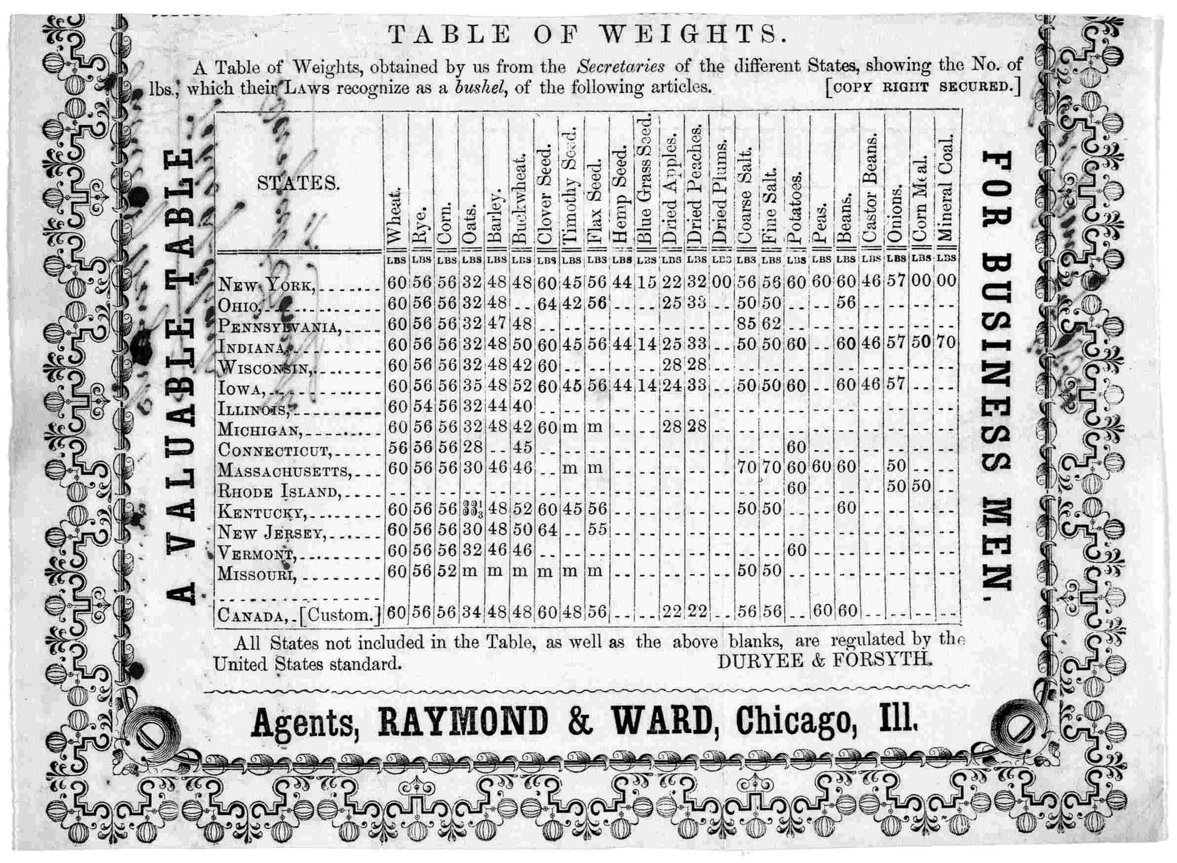 A table of weights from the secretaries of the different states, showing the number of pounds which their laws recognize as a bushel of different commodities. c. 1854